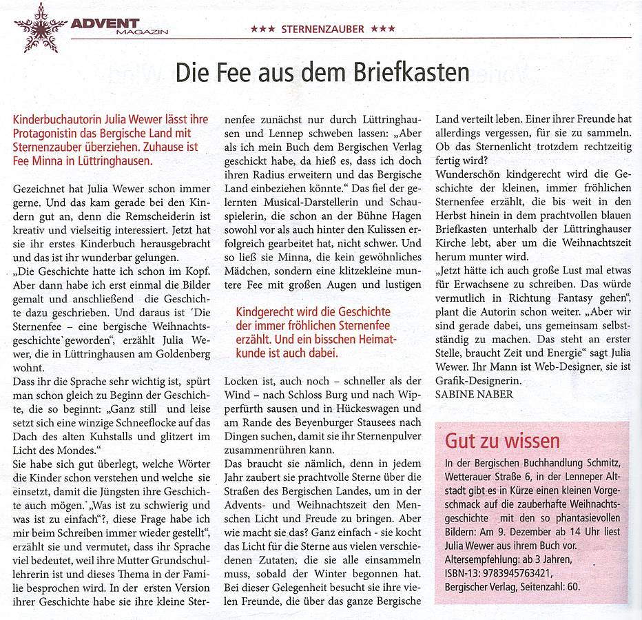 Wunderschön kindgerecht wird die Geschichte der kleinen, immer fröhlichen Sternenfee erzählt, die bis weit in den Herbst hinein in dem prachtvollen blauen Briefkasten unterhalb der Lüttringhauser Kirche lebt, aber um die Weihnachtszeit herum munter wird.