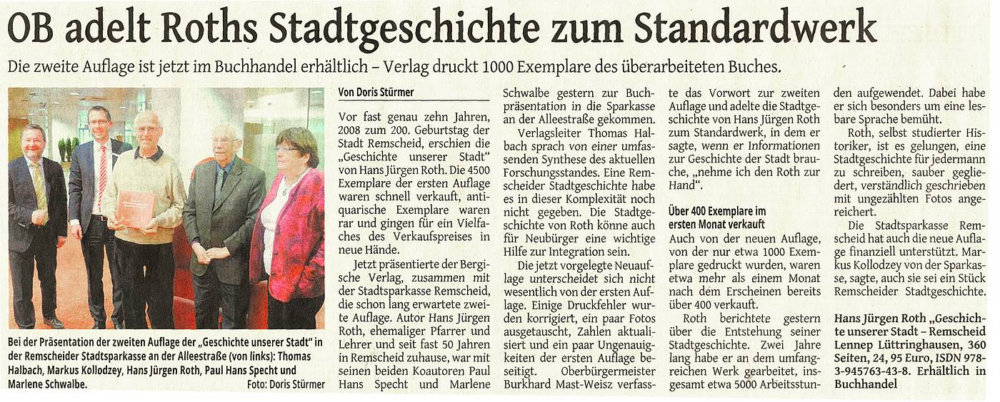 Verlagsleiter Thomas Halbach sprach von einer umfassenden Synthese des aktuellen Forschungsstandes. Eine Remscheider Stadtgeschichte habe es in dieser Komplexität noch nicht gegeben. Die Stadtgeschichte von Roth könne auch für Neubürger eine wichtige Hilfe zur Integration sein.
