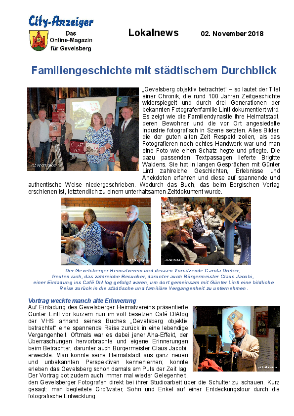 Seit 1901 in Gevelsberg ansässig, wurde das Fotoatelier von Anton Lintl in der Kölner Straße 6a binnen kürzester Zeit zu einer der wohl gefragtesten Institutionen innerhalb der Stadt. Ob geschäftlich oder privat, ob Portrait oder Produkt, ob Architektur oder Schaufenster: Überall, wo professionelle Aufnahmen in exzellenter Qualität gebraucht wurden, kamen Anton, sein Sohn Hans Günter und letztlich dessen Sohn Günter Lintl immer wieder zum Einsatz. Noch heute finden sich in unzähligen Familienalben und Firmenpublikationen Fotos made by Lintl. „Daran sieht man, das die Familie Lintl ihren Finger stets am Auslöser hatte, um das Gedächtnis einer Stadt bildlich festzuhalten“, sagte Carola Dreher, Vorsitzende vom Gevelsberger Heimatverein, zum Abschluss und konnte einen jeden nur dazu ermuntern, dieses Zeitdokument zu erwerben.
